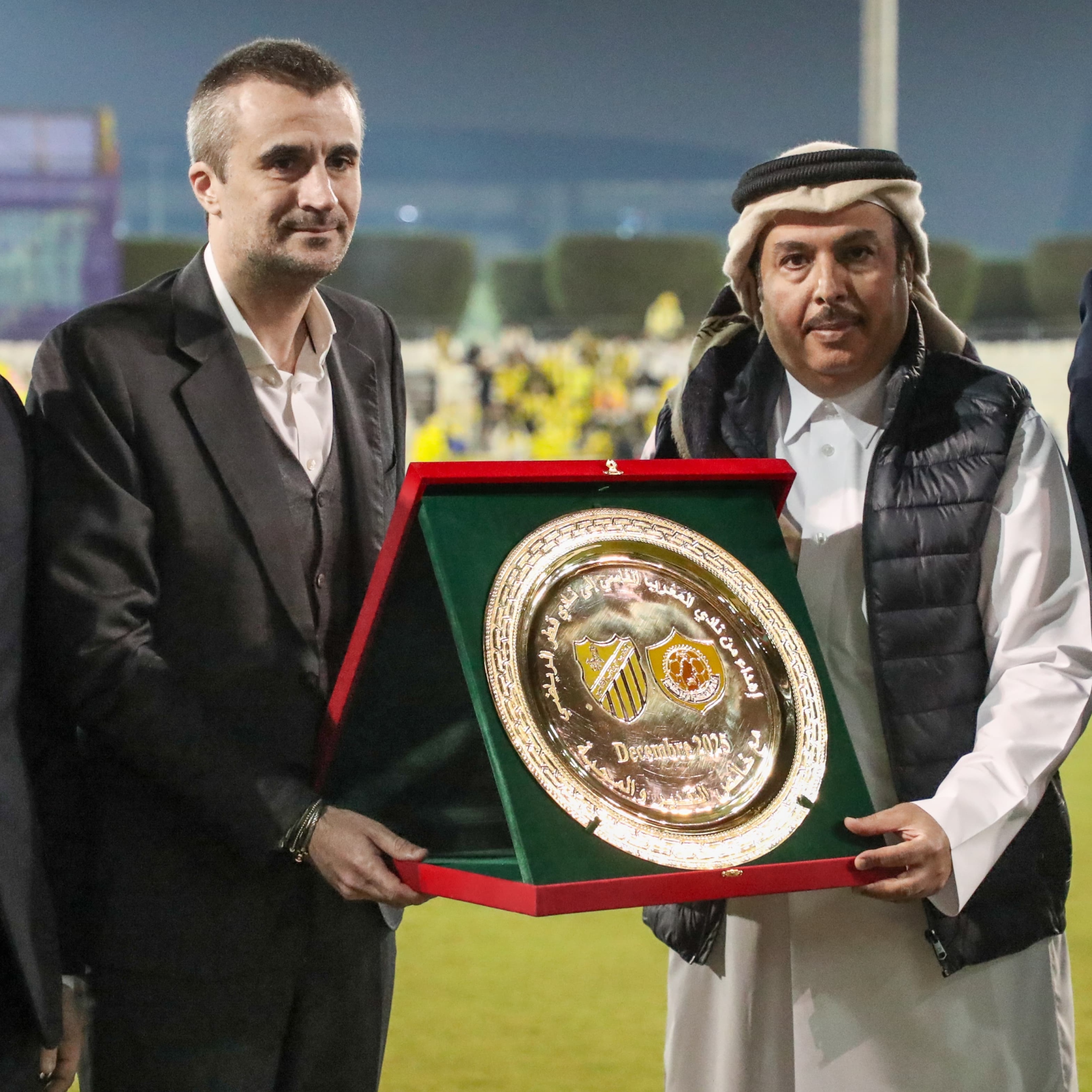 شهدت المباراة الودية التي جمعت بين نادينا ونادي المغرب الفاسي، اليوم تبادل الدروع بين السيد فيصل الكواري، المشرف العام على جهاز الكرة بنادي قطر، والسيد عمر بنيس، رئيس الشركة الرياضية لنادي المغرب الرياضي الفاسي، في لفتة تعبر عن التعاون المتبادل وتعزيز أواصر الصداقة بين الناديين.