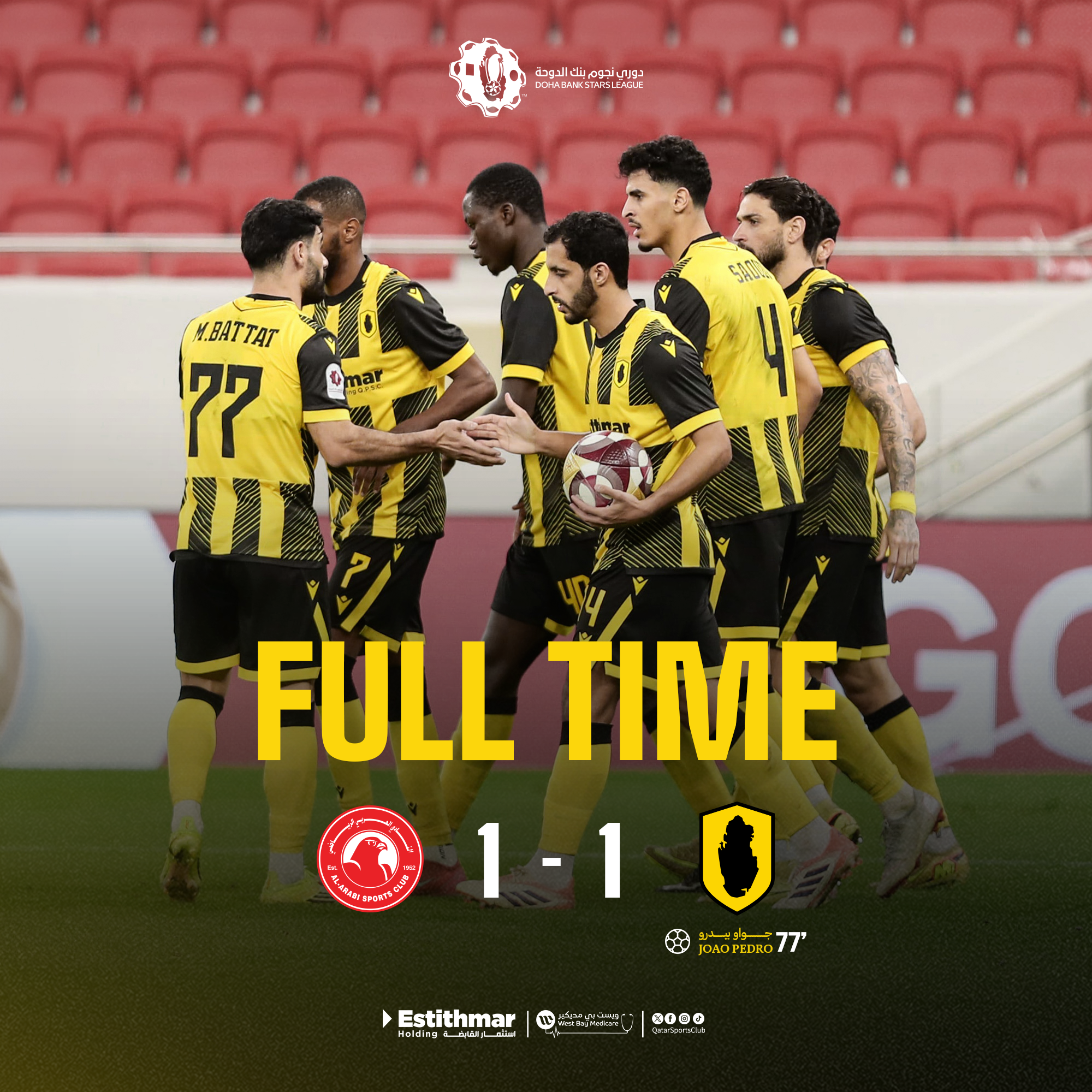تعادل فريقنا الأول لكرة القدم مع العربي بهدف لمثله، خلال المباراة التي جمعتهما اليوم على استاد الثمامة في الجولة الحادية والعشرين من الدوري القطري “دوري نجوم بنك الدوحة”.